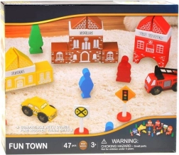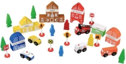 Indeholder klodser til at bygge en hel landsby, herunder brandstation, skole og bank.