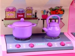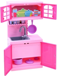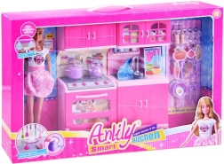 Med dette smukke sæt skaber børn nemt deres eget kokkeunivers. Dukke ANLILY i pastelfarvet kjole med forklæde og det detaljerede lyserøde køkken med ovn, vask, skabe og komfur giver timevis af sjov og realistisk madleg.