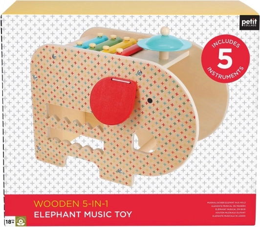 Introducer dine små til rytme og lyd med denne alsidige træelefant. Indeholder fem forskellige legefunktioner som at spille på en xylofon, tromme, bækken og mere.
