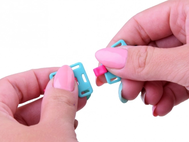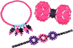 Sættet indeholder klart pink, sorte og lilla dele, som kan bruges til at skabe farverige og unikke accessoires.