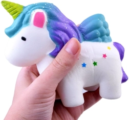 Sød skum-squishy enhjørning til børn og voksne hjælper med at mindske spænding og stress. Det bløde materiale kan klemmes, æltes og presses og takket være formhukommelse vender det altid tilbage til sin oprindelige form. Ideel til skole, kontor og på farten – behagelig at røre ved, farverig og sjov.