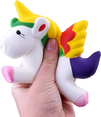 Denne farverige squishy-enhjørning er ideel, når du har brug for at slippe stress – under lektielæsning, i venteværelset hos lægen, før en vigtig samtale eller bare i løbet af dagen. Den bløde skum med formhukommelse gør det muligt at klemme, ælte og trykke legetøjet igen og igen uden at det mister sin form.