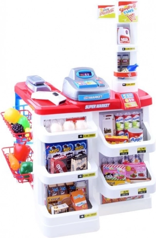 Børne supermarked med kasseapparat er et fantastisk stykke legetøj til små shoppingentusiaster. Dette farverige sæt indeholder i alt 24 elementer, der understøtter kreativ rollespil og læring. Børnene kan bruge rigtige penge og prisetiketter for at lære værdiansætte penge og shoppingprincipper. Legetøjet er lavet af kvalitetsplast og er holdbart og attraktivt.