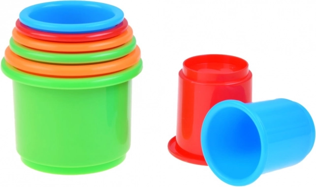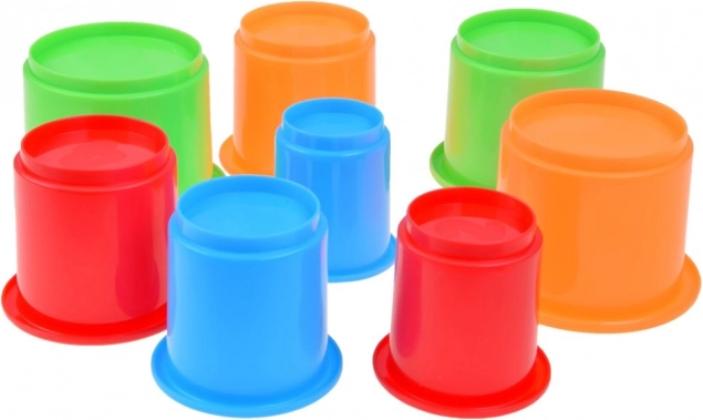 Sættet indeholder 8 kopper i klare farver, som kan lægges i hinanden og sparer plads. Leveres i en farverig gaveæske – et godt gaveidé til fødselsdag og som det første udviklende legetøj.