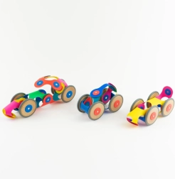 CLIXO Wheel Creator er et fleksibelt magnetisk byggesæt til børn i alderen 6–10 år, der udvikler kreativitet, rumlig forståelse og finmotorik. Takket være roterende magneter med fastholdelse i 24 positioner holder modellerne formen solidt og kan klare dynamisk leg. Træhjulene giver dine kreationer liv – fra biler og tog til søde små dyr – alt sammen i strålende regnbuefarver.
