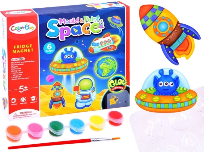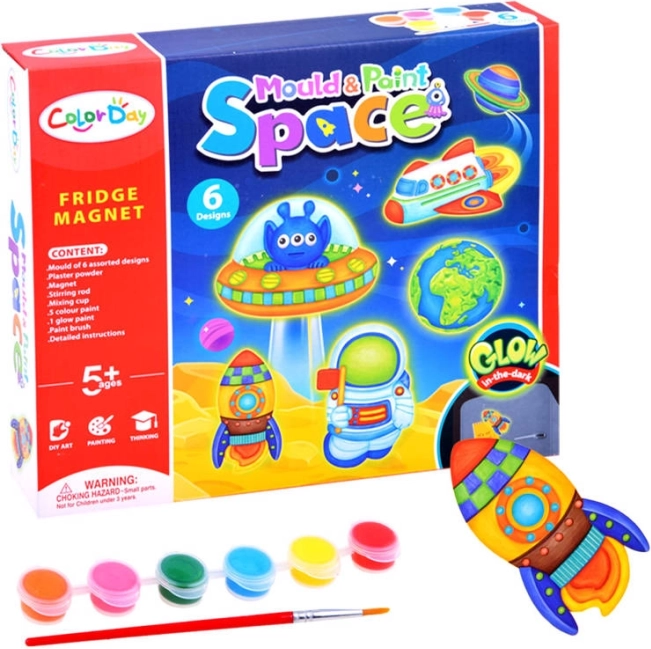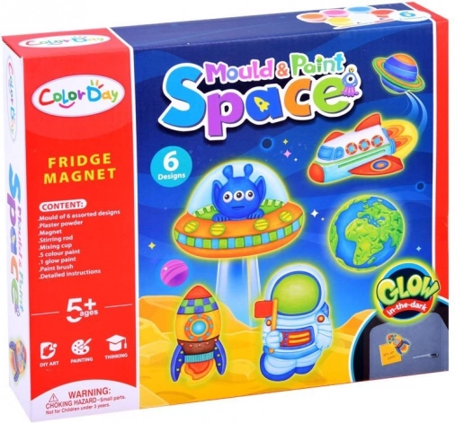 Opdag et sjovt kreativt sæt til børn, hvor de nemt kan lave og male deres egne rum-magneter til køleskabet. Sættet indeholder alt, hvad der er brug for – gips, forme, pensel, 6 farver, skål og rørepind samt magnetbånd. Det styrker finmotorik, kreativitet og læring gennem leg – en ideel gave til små skabere.