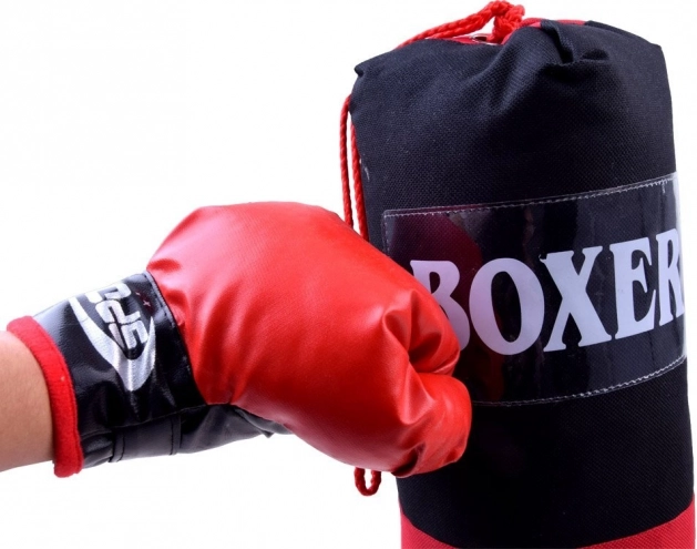 Komplet boksesæt til hjemmetræning og sjov. Indeholder 2 boksehandsker og en ophængt boksepose. Handsker i syntetisk læder med velcrolukning sikrer en komfortabel og sikker pasform. Posen er solidt gennemsyet, ophængt i metaløjer med snore. Ideel til udvikling af koordination, hastighed og smidighed.