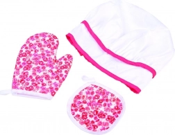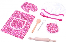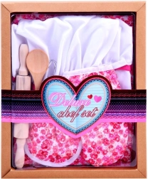 Indeholder alle nødvendighederne for en lille kok: forklæde, hue, handske, underlag og køkkenværktøj.