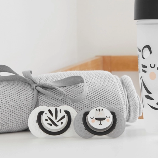 Det ergonomisk formede, udskårne skjold med store ventilationsåbninger muliggør fri næseånding og reducerer ophobning af spyt, hvilket forebygger irritation af følsom hud. Den sikre silikone er smags- og lugtfri, let at rengøre og har lang levetid. Et praktisk håndtag med ring gør det nemt at give sutten og fastgøre en kæde, og det medfølgende rejseetui holder sutterne hygiejnisk rene.