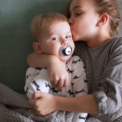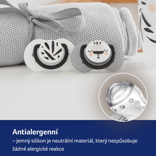 Moderne sort-hvide motiver til både drenge og piger. Pakken indeholder 2 sutter og en praktisk plastboks til hygiejnisk opbevaring hjemme og på farten.