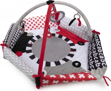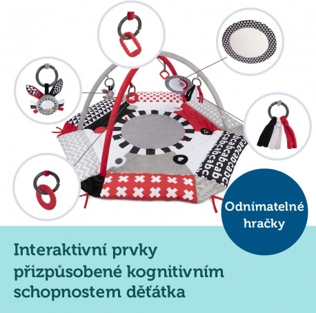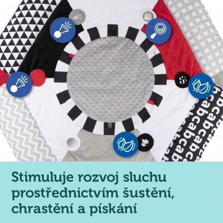 Det kontrastfyldte legetæppe SENSORY giver et sikkert og stimulerende miljø for dit barn. Det er designet til at støtte visuel og motorisk udvikling fra de første uger. Det kan fungere som legetæppe med kant, uden bøjle eller med legetøj på bøjlen og tilpasser sig behovene hos det voksende barn.