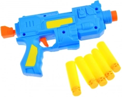 Sættet indeholder en rød vest, en blå børnepistol og et sæt bløde patroner – klar til leg lige efter udpakning.