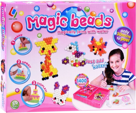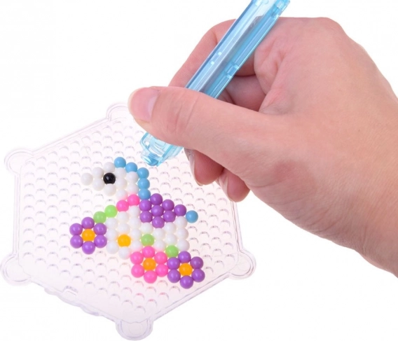 Med dette kreative sæt kan både børn og voksne lave farverige dekorationer på en enkel og sjov måde. Vælg bare et motiv fra den medfølgende bog, læg perlerne efter skabelonen og sprøjt dem med vand, så de hæfter.
