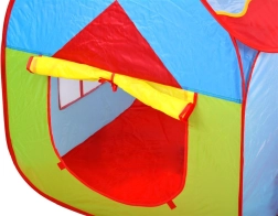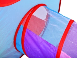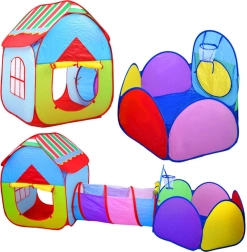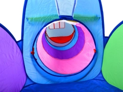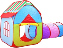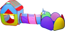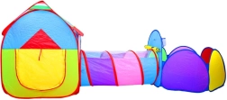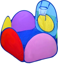 Farverigt 3-i-1 telt-sæt til børn, der kombinerer hus, tunnel og indhegning med kurv til bolde for endeløs sjov hjemme og i haven. Let konstruktion, hurtig opsætning og nedpakning, åndbare vinduer og sammenklappeligt design gør dette sæt til det ideelle sted til leg, kravlen og kast med bolde.