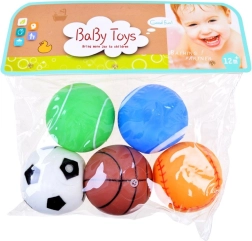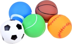 Dette alsidige sæt indeholder fem farverige gummibolde inspireret af populære sportsgrene: fodbold, basketball, tennis, baseball og amerikansk fodbold. Takket være den indbyggede piveindsats udsendes en sjov lyd ved tryk, som stimulerer børns nysgerrighed og udvikler finmotorikken.