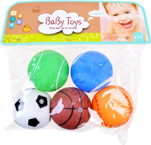 Det sjove sæt med fem gummibold med pivelyd vil glæde ethvert barn. Hver bold har design af en populær sport og udsender en glad pivelyd, når den trykkes. De er ideelle til leg i badekarret, i haven og til træning af kast og grib. Den bløde gummi ligger godt i hånden, og den kompakte størrelse på ca. 5 cm passer også til mindre børn.