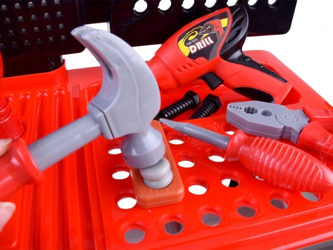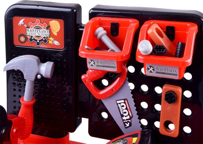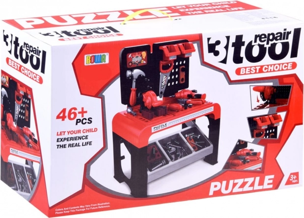 Sættet indeholder et arbejdsbord med hylder og arbejdsflade. Derudover er det udstyret med håndsav, skruetrækker med udskiftelige bits, hammer og tang. I sættet finder du også forskellige skruer, møtrikker og trælister med huller. Alt er opbevaret i en overskuelig æske, som gør det nemt at organisere delene.