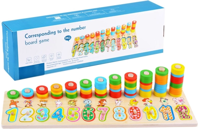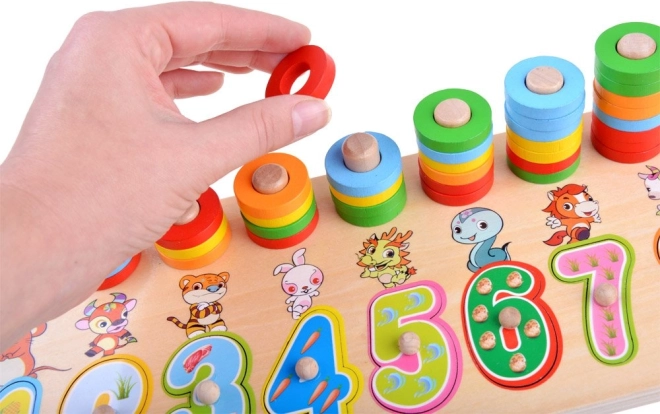 Denne lærerige trælegetøjsklassiker kombinerer formpuslespil, farvesortering og den første matematik. Børn lægger store tal i de rigtige åbninger og trækker farvede ringe på pinde, hvilket gør det let at forstå talværdi og basal regning. Dyreillustrationer ved de enkelte tal støtter hukommelsen og udvikler ordforrådet.