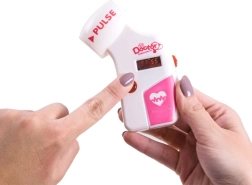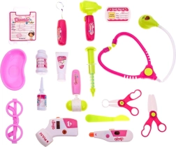 Stetoskop med blinkende hjerte, termometer og blodtryksmåler med bagbelyste værdier, otoskop, sprøjte, saks, hammer og andet tilbehør.