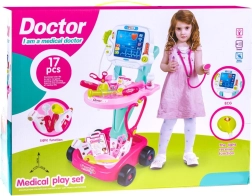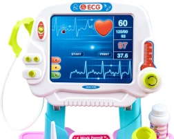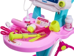 Det interaktive panel med effekter (lys og lyde) simulerer patientovervågning, mens funktionelle elementer som det “blinkende hjerte” på stetoskopet og bagbelyste værdier på termometeret og blodtryksmåleren gør legen endnu mere fængende. Vognen med hjul muliggør nem flytning af hele sættet.