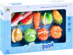 Sjovt sæt til små kokke indeholder en sikker plastkniv, et skærebræt og et farverigt udvalg af grøntsager, der “skæres” fra hinanden med velcro. Understøtter finmotorik, øje–hånd-koordination og kreativ rolleleg i køkkenet uden risiko.