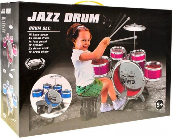 Dette attraktive børne-trommesæt indeholder 5 trommer, bækken, pedal til stortromme, skammel og trommestikker – alt hvad den lille trommeslager behøver til sin første “koncert”. Takket være den lette konstruktion og sikre plastmaterialer er sættet velegnet til begyndere og er let at transportere og opbevare.