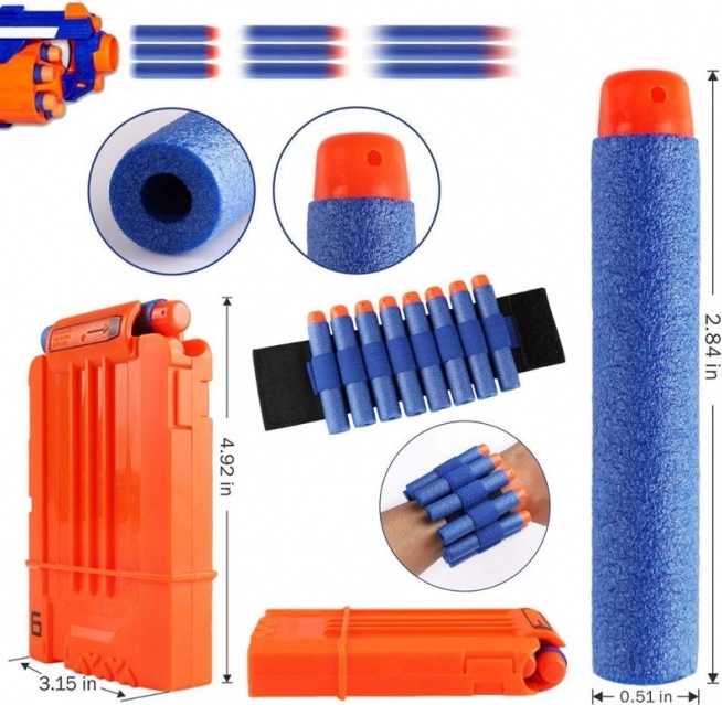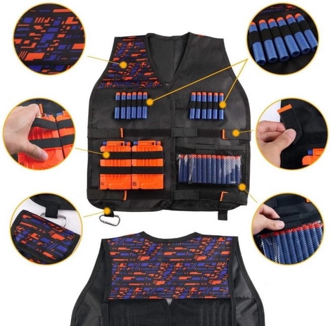 Sættets indhold: Sættet er udstyret med et magasin, der giver dig mulighed for at skyde: Sættet indeholder en taktisk skudsikker vest, beskyttelsesbriller, 30 pile, et ansigtstørklæde med print, en ammunitionsrem til håndleddet og et ekstra ammunitionsmagasin.