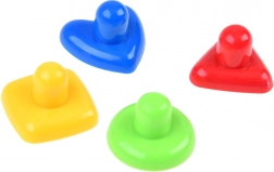 Fire farvede stempler – hjerte, trekant, firkant og cirkel – støtter genkendelse af former og farver samt udvikling af finmotorik.