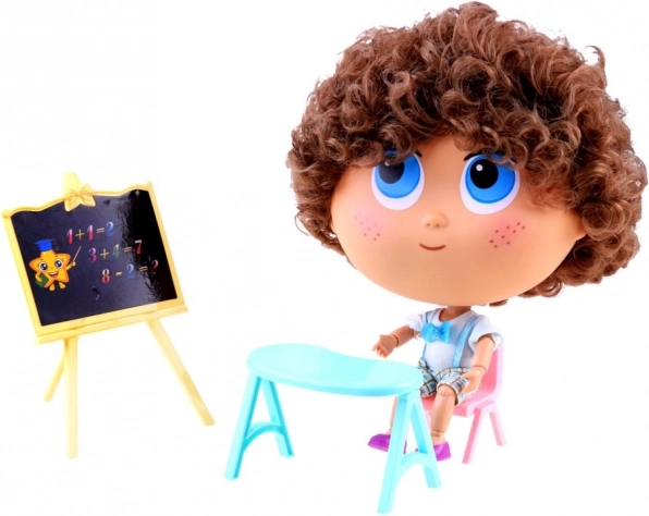 Den søde dukke-lærer Tymek til rolleleg som skole giver børn masser af fantasi og sjov. I sættet finder du tavle, bord og stol. Dukken har bevægelige led og et hoved, der kan drejes 360°, store blå øjne, fregner og krøllet hår. Perfekt til rollelege og udvikling af kreativitet.