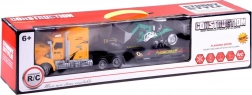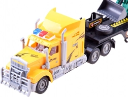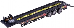 Trækkeren med fladladstrailer transporterer sikkert traktoren med påhængsvogn. En kombination til mange timers kreativ leg.