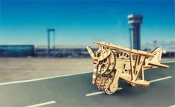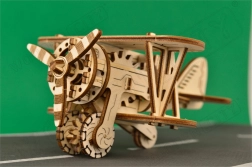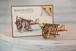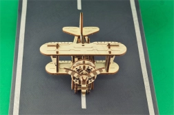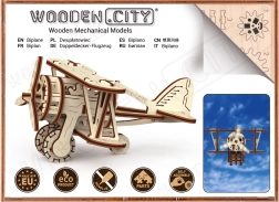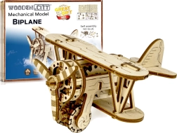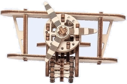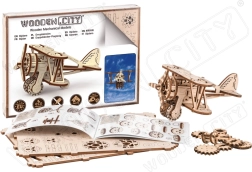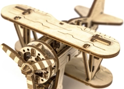 Træ mekanisk byggesæt i form af en dobbeldækker tilbyder et unikt design og overraskende detaljer. Med modelpræcision vil du transporteres ind i luftens eventyr sammen med luftfartspionerer som Antoine de Saint-Exupéry. Denne model er drevet af gummibånd med justerbar acceleration, der får propellen til at snurre og gør det muligt for flyet at accelerere på flad overflade.