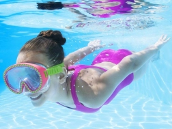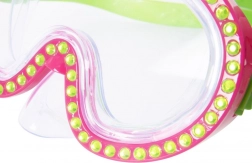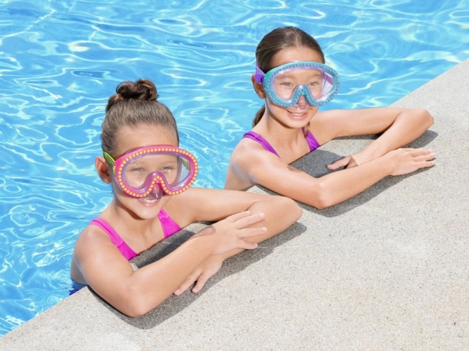 Svømmemasken er pyntet med krystaller, som giver masken et unikt og elegant look, mens børnene nyder svømningen.