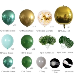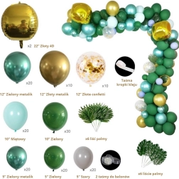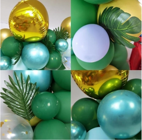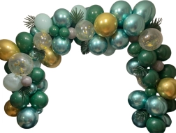 Monteringen er enkel: pust ballonerne op med luft eller helium og fastgør dem i hulbåndet. Placer de mindre balloner langs kanten for en fyldig og lagdelt effekt. Tropiske og palmeblade giver et eksotisk præg og passer perfekt til den grøn-guld farvepalette.