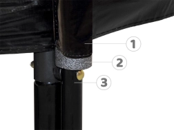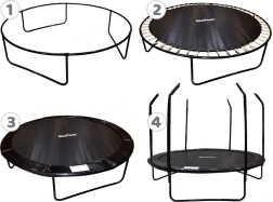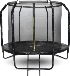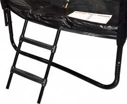 Hoppefladen i polypropylen JUMPING MAT er syet med 8 stærke sømme, hvilket øger modstanden mod belastning. Profilerede metalstolper er dækket af blød beskyttelsesskum, og indgangen til trampolinen har dobbelt sikring (lynlås + spænde). En totrinsstige gør det let at stige op.
