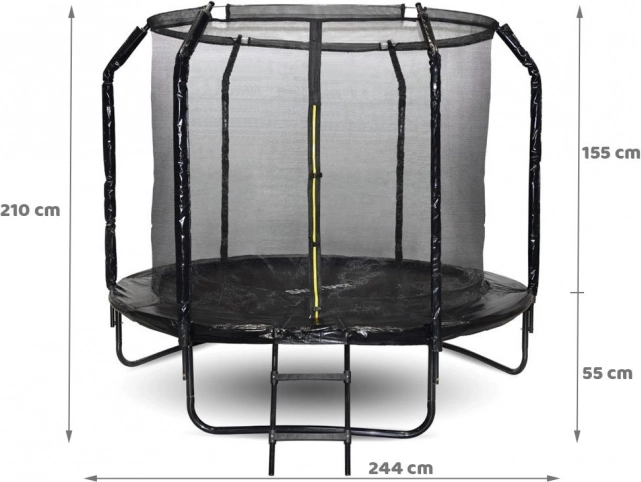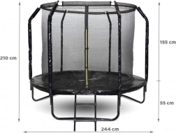Trampolinen SKYFLYER med en diameter på 244 cm er et fremragende valg for familier, der vil fremme aktiv bevægelse hos både børn og voksne. Den robuste konstruktion med U-ben, kraftige fjedre og tæt sikkerhedsnet med stabil ringforstærkning giver maksimal sikkerhed og stabilitet under hop.