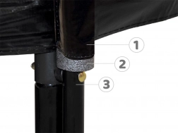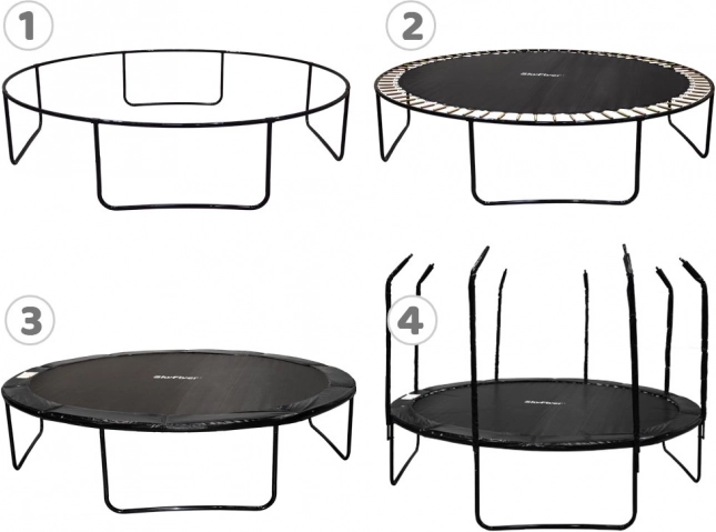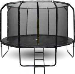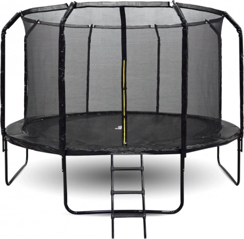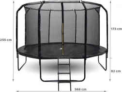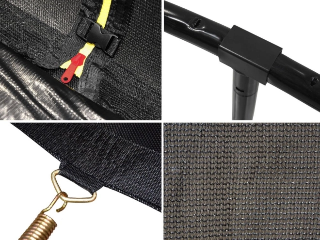 Det høje beskyttelsesnet spændt med ring bevarer formen, og indgangen er sikret med lynlås og spænde. De profilerede metalstolper har blød polstring for sikker hopping.