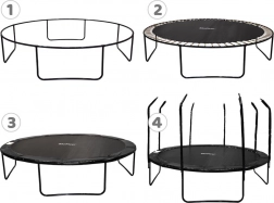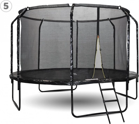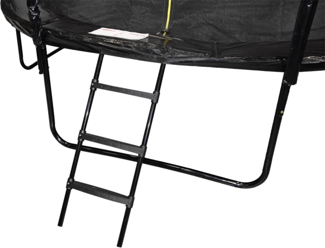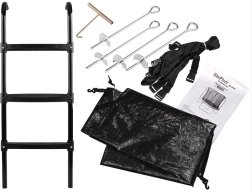 Den massive ramme med kraftige oxiderede fjedre og U-ben holder trampolinen solidt på plads, mens beskyttelseskraven dækker fjedrene sikkert. Den praktiske tretrins stige gør det let for børn at komme op. I pakken finder du også ankre med remme, et vandafvisende cover og monteringsværktøj – alt til nem installation og problemfri brug.