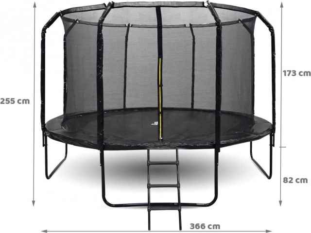 Gør din have til et sted for sjov og sund bevægelse. Trampolinen SKYFLYER 366 cm kombinerer robust konstruktion med gennemtænkte sikkerhedsfunktioner: indre beskyttelsesnet med ring til opstramning, polstrede, profilerede stolper og dobbelt-sikret indgang med lynlås og spænde. Springfladen af det holdbare Jumping Mat PP-materiale er flerfoldigt syet (8 sømme), hvilket sikrer lang levetid selv ved intensiv brug.