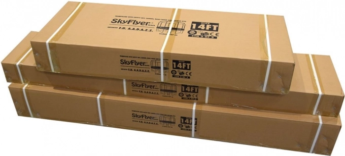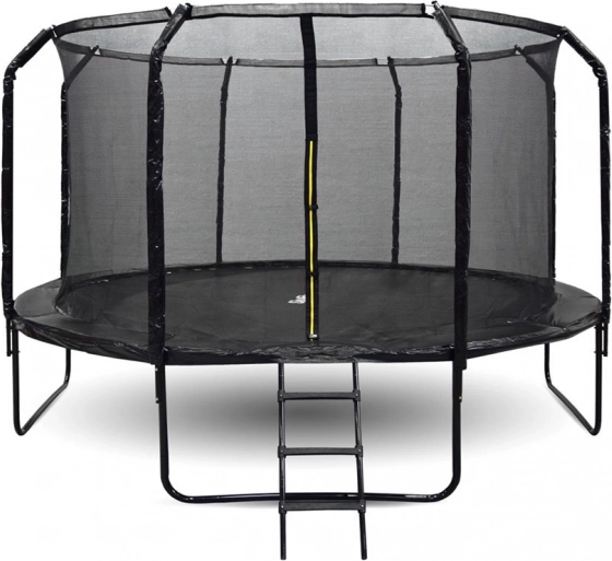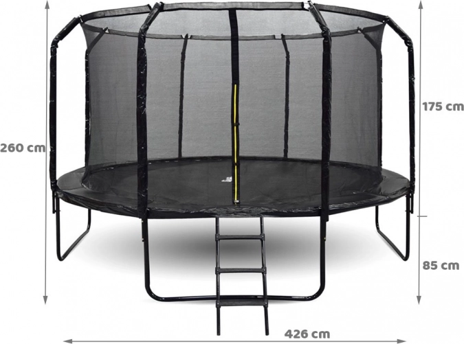 Den robuste SkyFlyer-trampolin med en diameter på 426 cm (14 ft) tilbyder generøs plads til hop, konditionstræning og leg. Sikkerheden varetages af et højt sikkerhedsnet spændt med en øvre ring og blødt polstrede profilerede stolper. Indgangen er sikret med lynlås og spænde for maksimal børnesikkerhed.