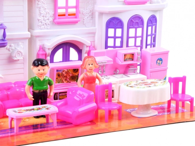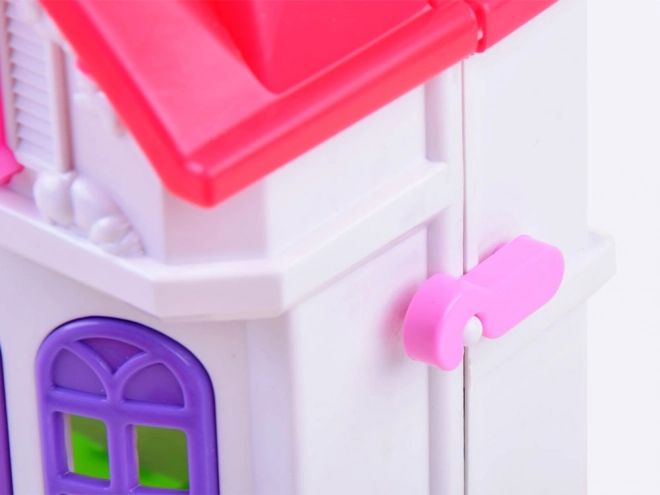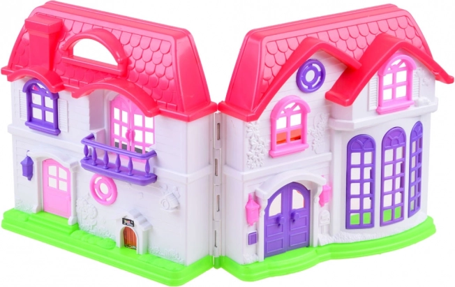 Det sammenklappelige hus begejstrer med levende farver og detaljeret udførelse – facaden er pyntet med relieffer af blomster og småfugle. Når det åbnes, opstår et overskueligt legeområde, hvor børn nemt kan placere møblerne. Figurerne af mor, far og datter har bevægelige arme og drejeligt hoved, så der er lagt op til masser af rolleleg. Den praktiske dørklokke med lyseffekt varsler gæsters ankomst og giver legen fornemmelsen af et rigtigt hjem.