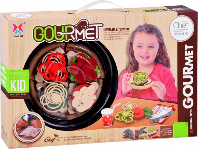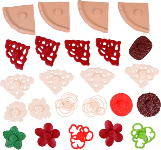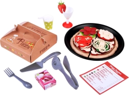 Sættet indeholder dejstykker, sauce, skiver ost og mange farverige toppings som peperoni, svampe, peberfrugt, tomat og salat. Der medfølger også pizzahjul, pizzaspade, bestik, tallerken, drikkekrus, menu samt pizzabakke/-æske.