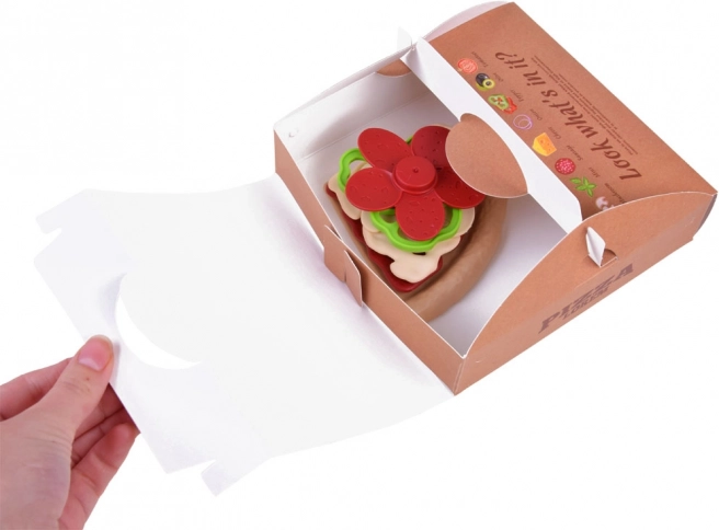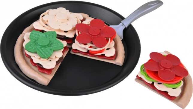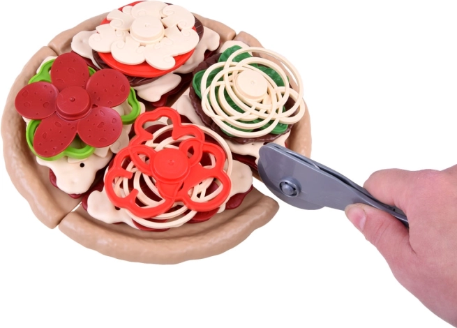 Pizzaen er delt i stykker og kan nemt “skæres” med det plastiske pizzahjul. Børn træner finmotorik og oplever realistisk madlavning.