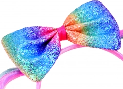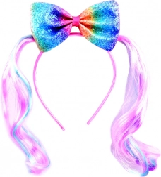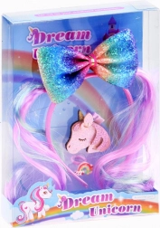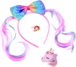 Et stilfuldt og farverigt sæt hårtilbehør, der skaber et eventyrligt look på ingen tid. Hårbøjlen med blødt satinovertræk er behagelig at have på og prydes af en markant glitrende sløjfe i regnbuens farver med pony-motiv. Sættet fuldendes af en glansfuld klemme med enhjørning og en sød plastikring med regnbue, som giver outfittet et legende strejf.