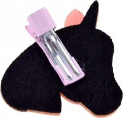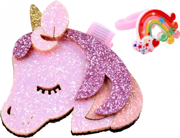 Den glansfulde klemme formet som et enhjørningehoved holder håret på plads og tilfører et legende, eventyrligt præg.