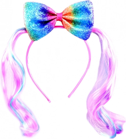 Den iøjnefaldende sløjfe i regnbuefarver fanger straks opmærksomheden og giver frisyren et unikt, festligt udtryk.