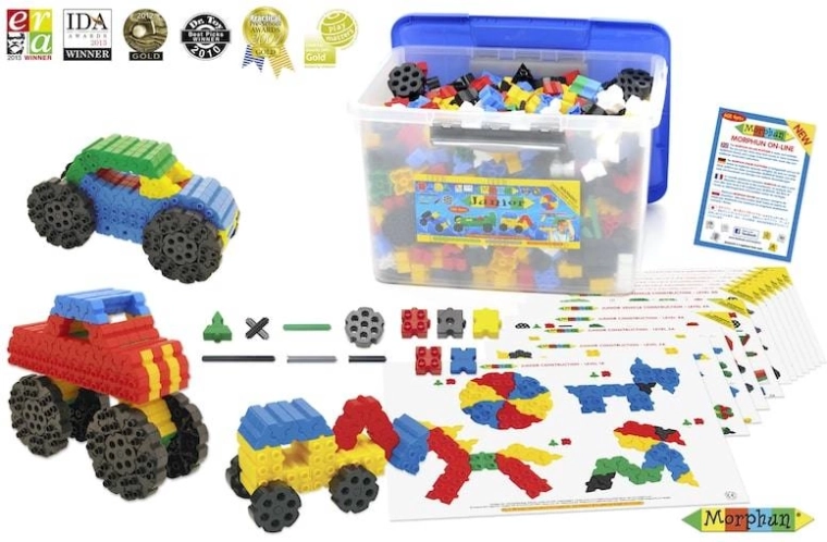 Morphun Junior byggeklodser er op til 1000 farverige elementer, hvoraf man kan skabe figurer, dyr, maskiner og andre kunstneriske værker, alt sammen i to og tre dimensioner. Sættet indeholder desuden elementer, der gør det muligt at lave bevægelige konstruktioner – biler, tog eller en vindmølle. Det takket være dele som hjul og specielle aksler/koblinger. En anden fordel er den unikke måde at kombinere disse klodser på. Blokkene kan forbindes ovenfra og nedefra, men også fra siderne. Denne forbindelsesmetode gør det muligt at bygge praktisk talt enhver fler-dimensionel konstruktion fra meget enkle flade modeller til store bevægelige strukturer. Et stort antal forskelligt formede elementer gør det muligt for flere børn at lege samtidig. Det er virkelig en meget udviklende og kreativ underholdning..