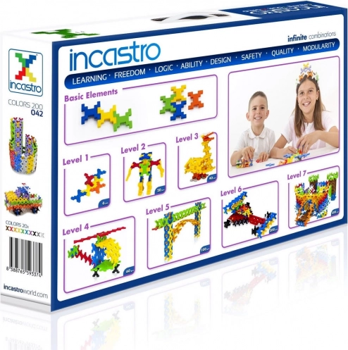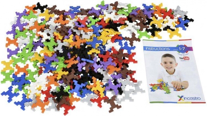 INCASTRO er et smart byggesæt fremstillet i Italien, som takket være den gennemtænkte form på delene tilbyder næsten ubegrænsede muligheder. Med få stykker kan du nemt samle flade mønstre, tårne, køretøjer, dyr og funktionsdygtige modeller. Delene passer præcist sammen, og konstruktionerne holder solidt.