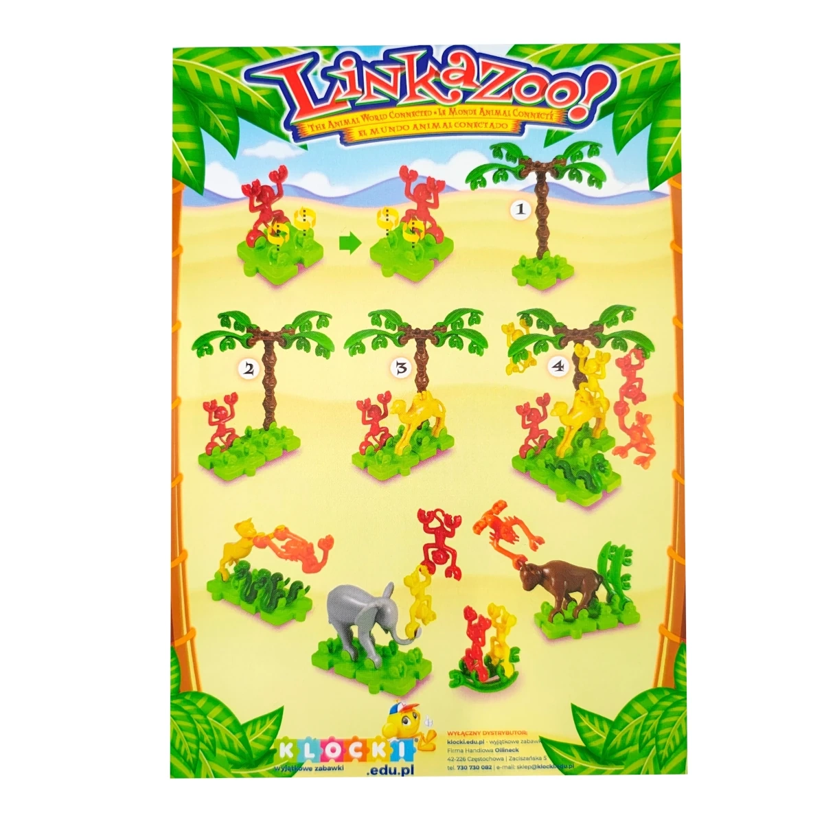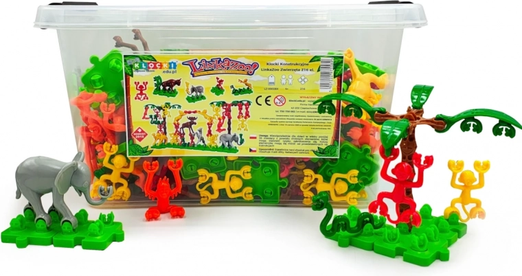 Byggesættet LinkaZoo bringer et alsidigt udvalg af dyredele med kroge og forbindelser, som børn nemt kan hænge op, kæde sammen og balancere. Takket være modulære baser kan der skabes originale zoologiske haver, jungler og legescener, som understøtter koncentration, tålmodighed og rumlig forestillingsevne.