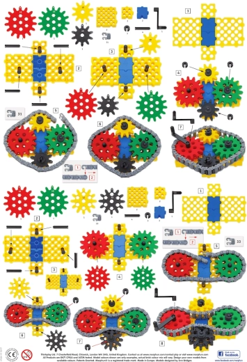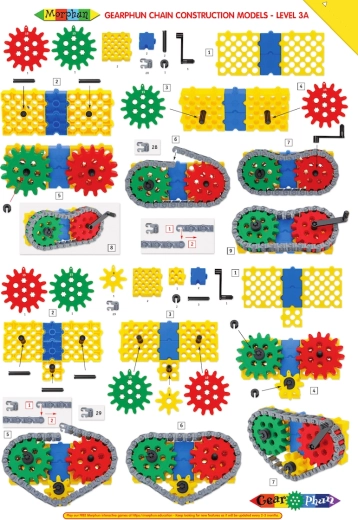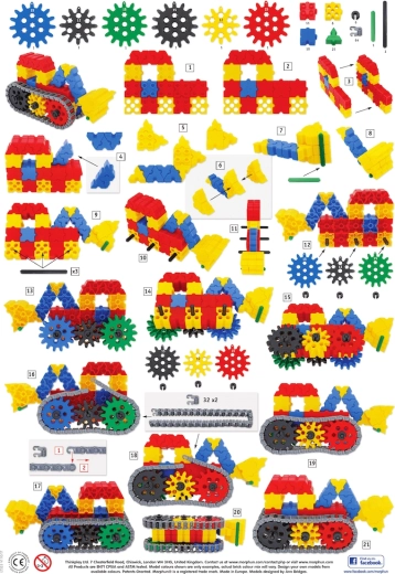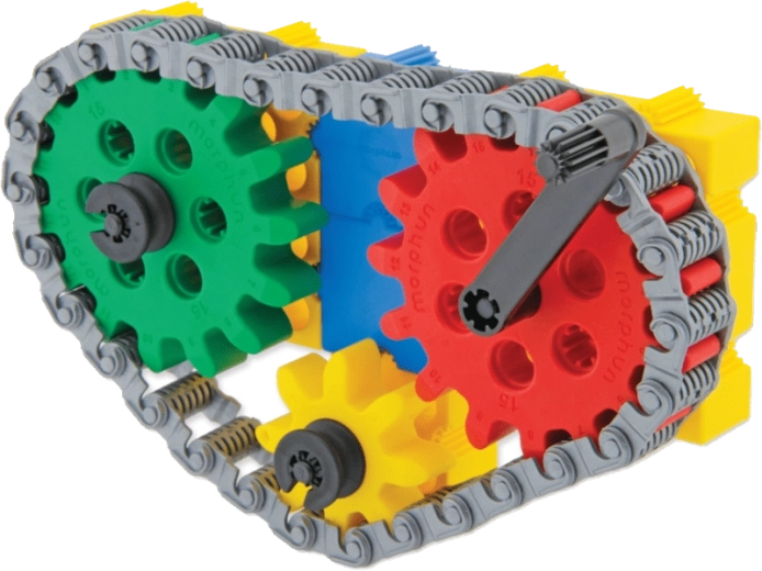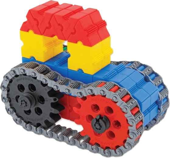 Byggesættet MORPHUN GearPhun bringer farvede klodser, tandhjul i 5 størrelser, kæder, koblinger og andre elementer til at bygge funktionsdygtige mekanismer. Sættet indeholder 4 ark vejledninger, som hjælper børn med trinvis at bygge maskiner, køretøjer og andre bevægelige konstruktioner – fra en bæltegraver til en vejtromle.