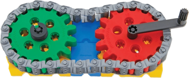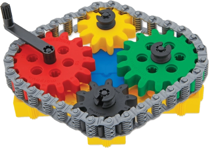 Børn forstår nemt bevægelsens mekanik – de kobler tandhjul, kæde og håndsving og ser hele mekanismen sætte i gang.